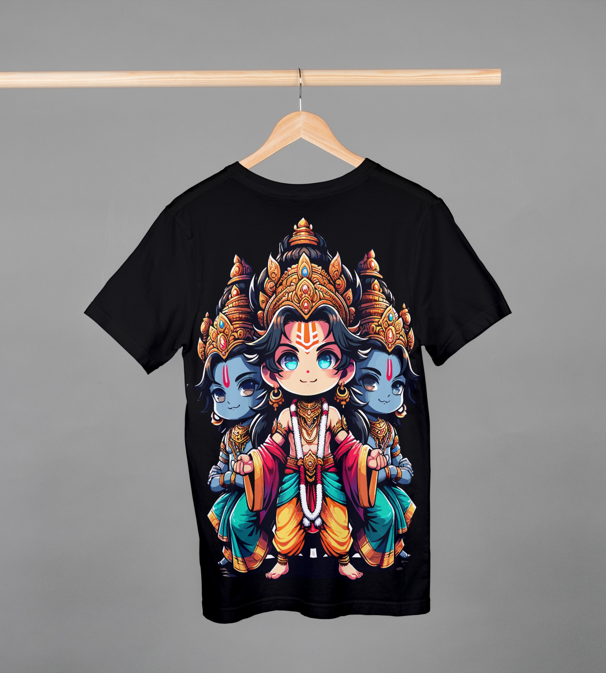 The Trinity Guardians Oversized Tee features an adorable chibi-style depiction of a powerful mythic trio-beautifully detailed with rich colors, ornate crowns, and expressive features. This design celebrates divine positivity, charm, and cultural flair in a fun, youthful, and modern format.